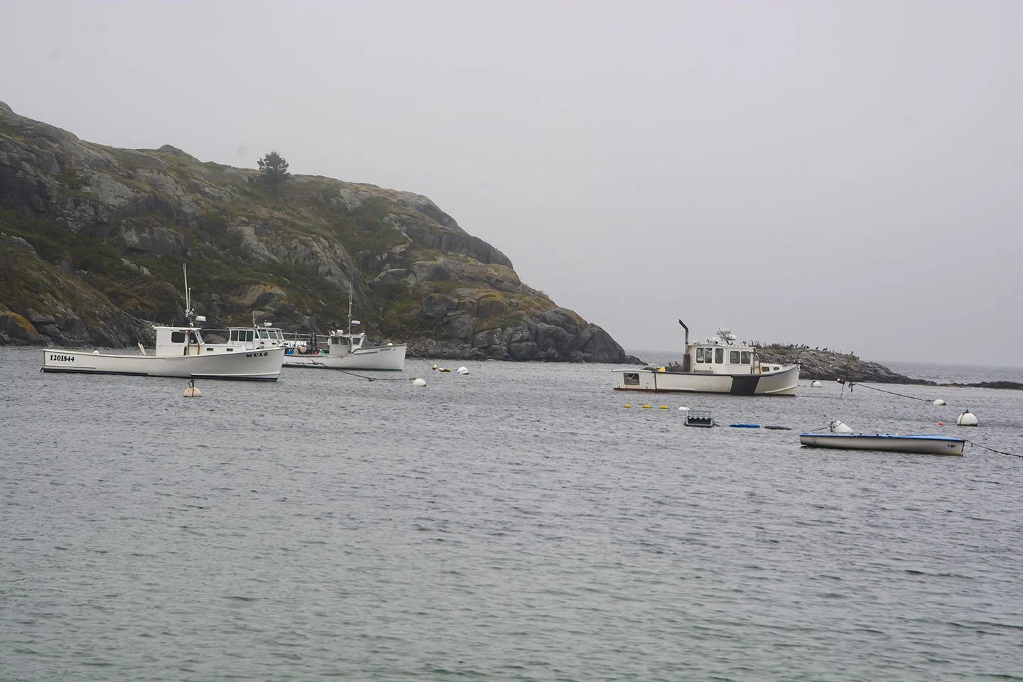 Lobster boats anchor in Monhegan Harbor. The island of Manana is in the background.